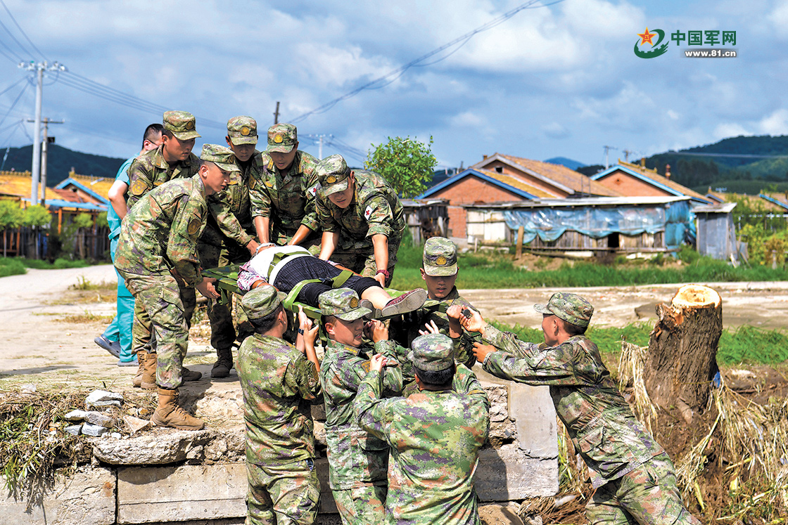 8月9日,北部战区陆军某旅官兵在吉林省舒兰市青松林场转移受伤群众。沈旭辰摄
