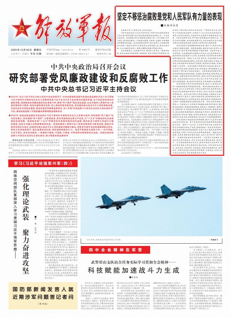 中共中央政治局12月25日召开会议,听取中央纪委国家监委工作汇报,研究部署2026年党风廉政建设和反腐败工作。习主席主持会议。会议强调,坚定不移推进反腐败斗争,一步不停歇、半步不退让,深化标本兼治,一体推进不敢腐、不能腐、不想腐,不断增强治理腐败综合效能。我军是党绝对领导下的人民军队,必须把思想和行动统一到党中央和习主席的重大决策部署上来,强化反腐必胜、正义必胜的信念信心,坚持不懈将反腐败斗争进行到底。