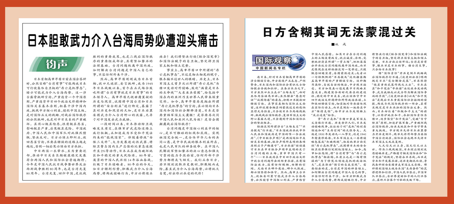 解放军报“钧声”文章《日本胆敢武力介入台海局势必遭迎头痛击》和“国际观察”文章《日方含糊其词无法蒙混过关》。