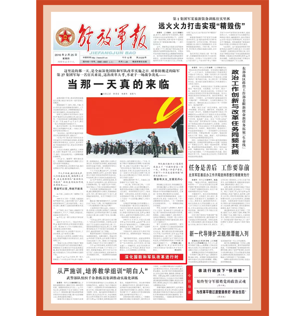 “凌晨的冀中平原,寒夜笼罩的城镇还在沉睡,地处石家庄的一座军营却已经醒来……”2015年年底,按照习主席和中央军委命令,陆军原第27集团军从河北移防山西,成为全军第一个因改革而进行部署调整的军级单位。军报记者第一时间深入这个集团军采访,动情写下长篇通讯《当那一天真的来临》。在改革强军的征途上,解放军报始终积极引导舆论、凝聚共识、激发力量。