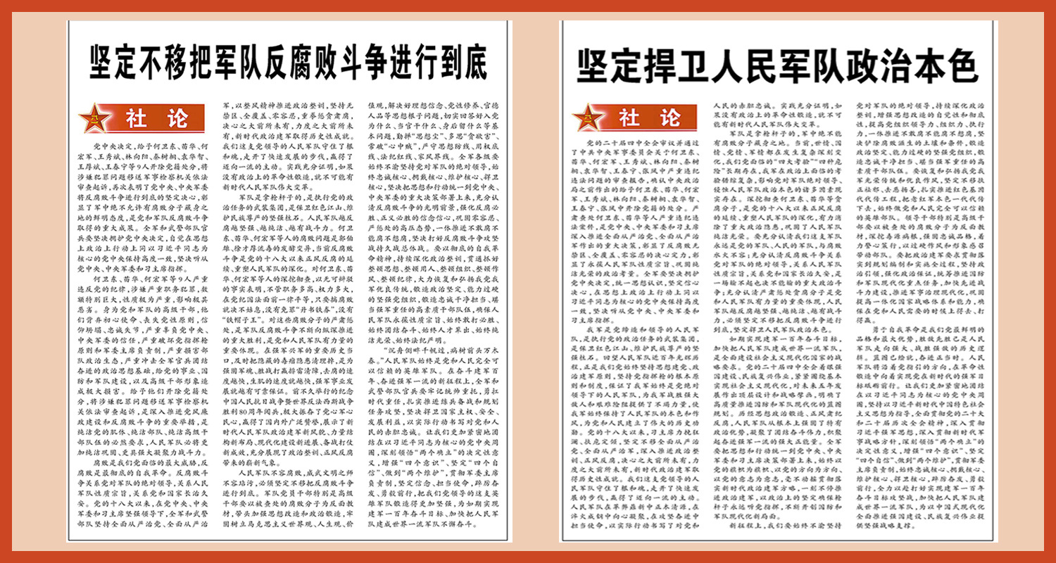 解放军报社论《坚定不移把军队反腐败斗争进行到底》和《坚定捍卫人民军队政治本色》。