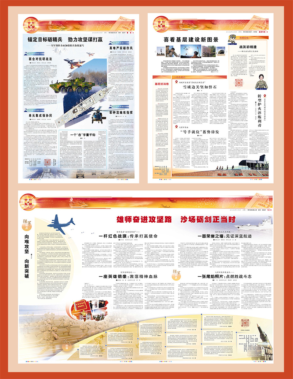 进入新征程,解放军报密集开设“在习近平强军思想指引下·我们在战位报告”“记者在战位”“平凡的战位 奋斗的青春”等“战位”系列专栏;相继推出“在习近平强军思想指引下·奋进强军路 打好攻坚战”“强军新征程 跑出加速度”“奋斗强军写荣光”等“强军”系列主题策划……一篇篇重磅报道,展现出全军官兵牢记统帅嘱托、积极练兵备战、攻坚建军百年的火热实践和昂扬风貌。