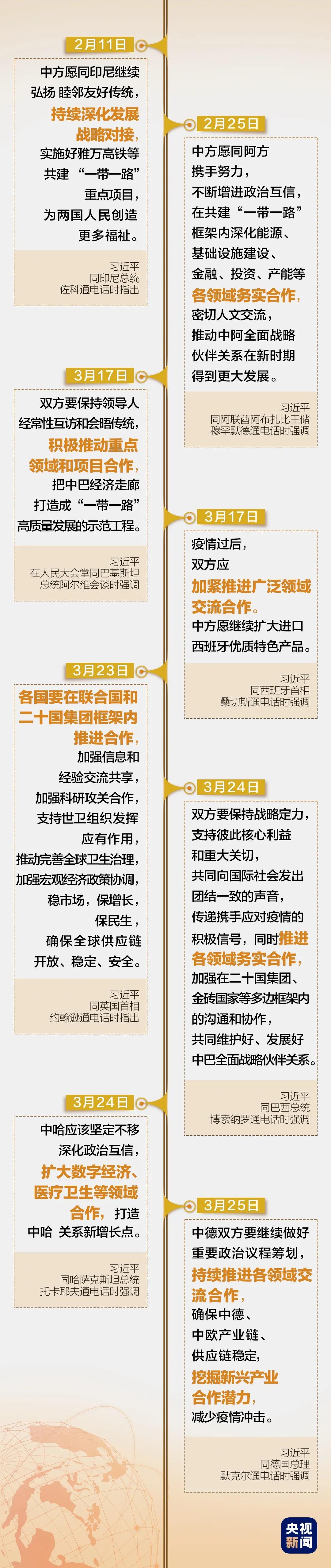 在同多国领导人的会谈和通话中,习近平主席表示中国愿携手各方,积极深化各领域务实合作,共同抵御疫情对世界经济带来的冲击。