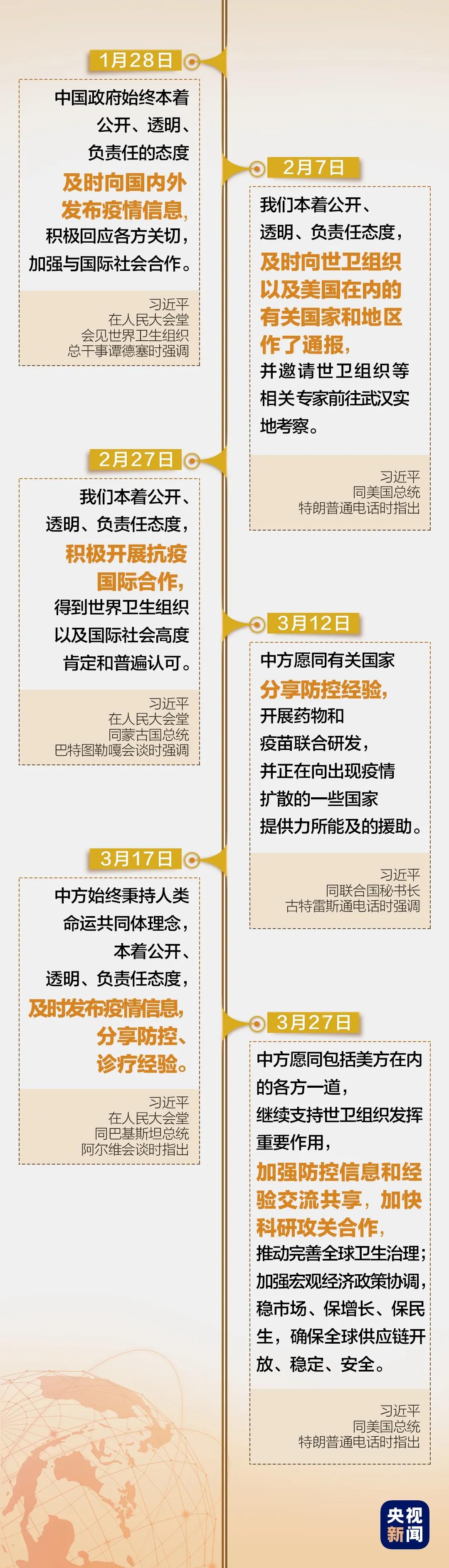 在与外方领导人和国际组织负责人的会谈、通话中,习近平多次表示,中国政府本着“公开、透明、负责任”的态度,及时向国内外发布疫情信息,积极回应各方关切,加强与国际社会合作。