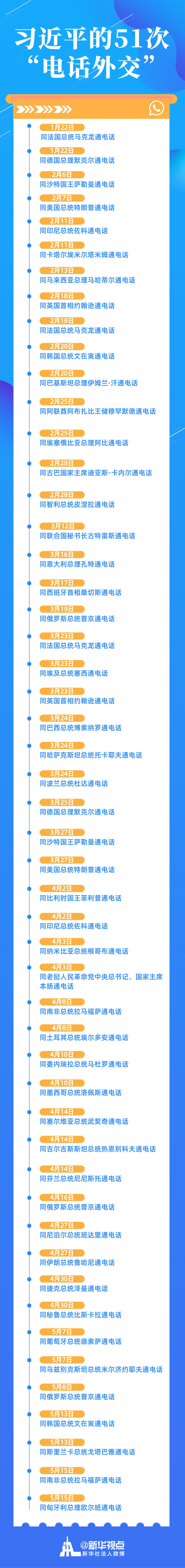 俄罗斯总统普京、法国总统马克龙,都是三次。同马克龙通电话,分别是在1月22日、2月18日和3月23日;同普京通话,分别是3月19日、4月16日和5月8日。