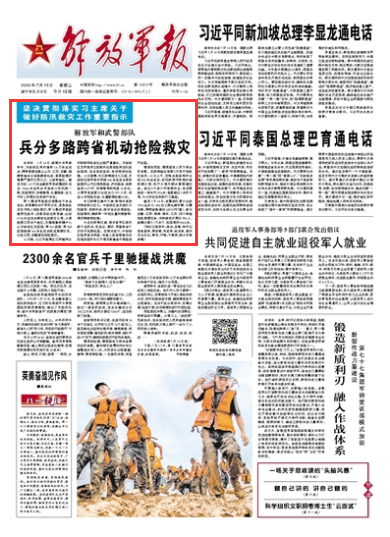 截至7月14日,武警部队累计出动7550名兵力、482台工程机械车辆、96艘舟艇,携带装备器材22973件(套),参与安徽、江西、湖南、湖北、江苏、四川等地抢险救援任务,共转移受灾群众980人,装填沙袋9.7万余个,加固堤坝9660米。