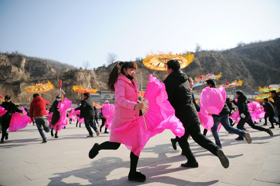 陕西延川文安驿镇梁家河村村民在排练秧歌(2018年2月8日摄)。新华社发(张博文 摄)
