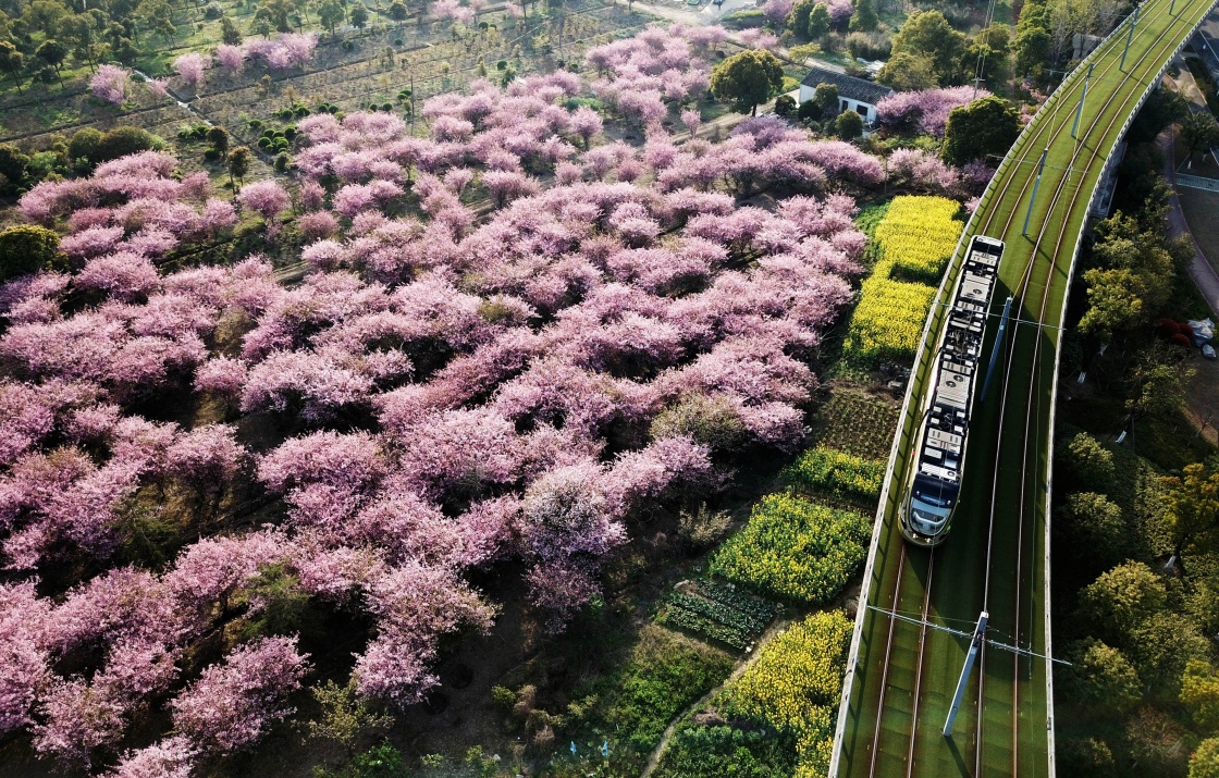 在江苏苏州高新区,一辆有轨电车从一片盛开的垂丝海棠旁驶过(2018年3月28日摄)。新华社发(徐志强 摄)