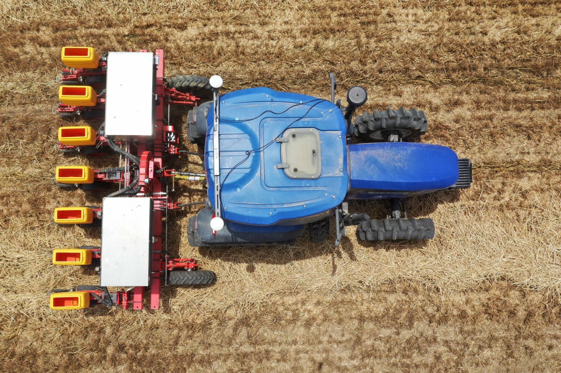 在河南省邓州市小杨营镇安众村,加装有北斗导航系统的拖拉机在无人驾驶状态下播种(2020年5月26日摄,无人机照片)。新华社记者 冯大鹏 摄