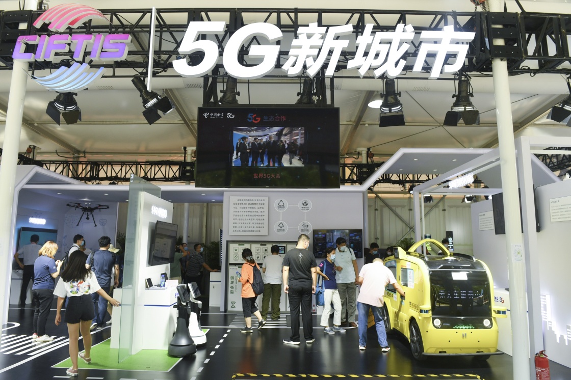 观众在2020年中国国际服务贸易交易会5G通信服务专题展区参观(2020年9月7日摄)。新华社记者 鲁鹏 摄