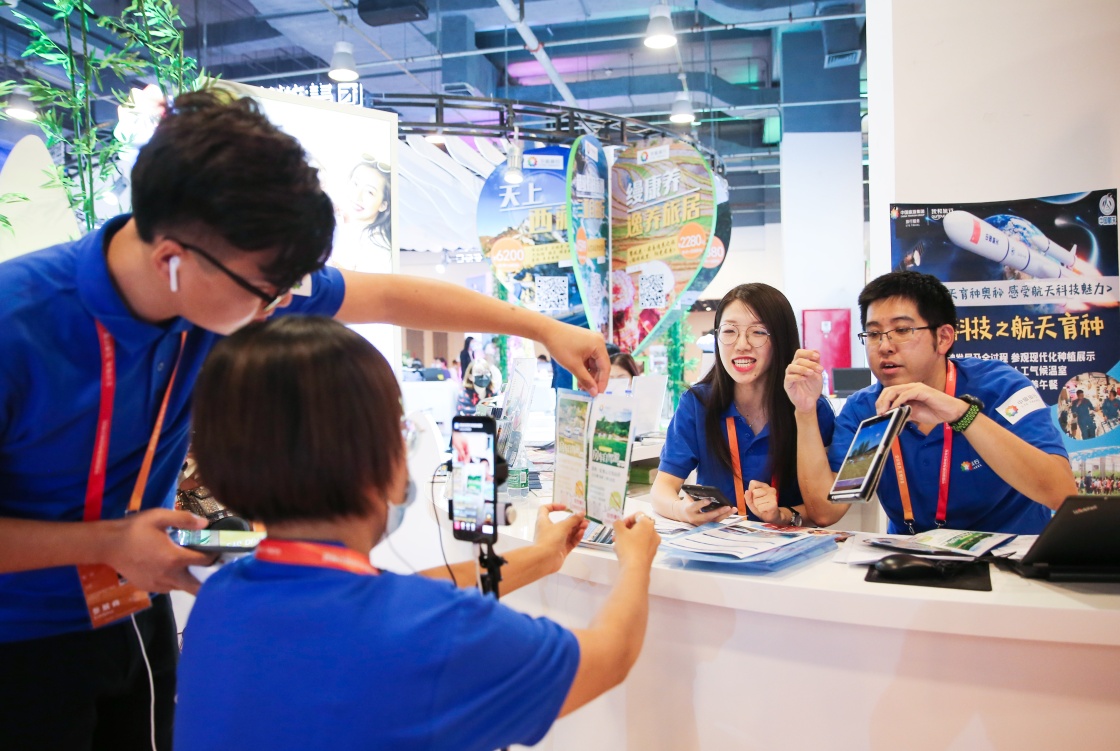 在2020年中国国际服务贸易交易会旅游服务专题展区,中国旅游集团展位的工作人员通过直播向线上观众介绍旅游服务产品(2020年9月5日摄)。新华社记者 潘思危 摄