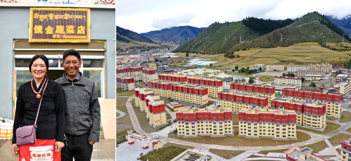 2020年9月22日拍摄的拼版照片:左图为西藏自治区昌都市类乌齐县长毛岭乡达雄村村民俄金(右)和妻子阿丁在安置点俄金蔬菜店前;右图为类乌齐县桑多扶贫开发区易地扶贫搬迁安置点一角(无人机照片)。新华社记者 詹彦 摄