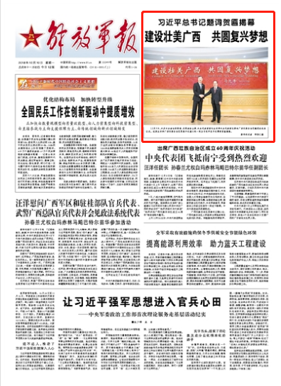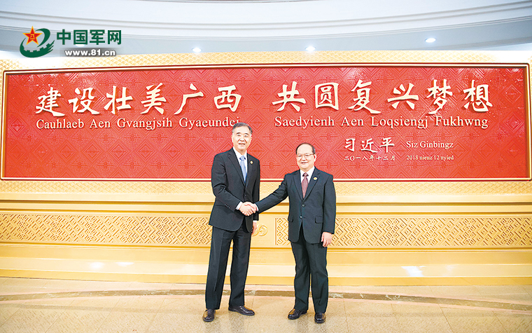 12月9日,中共中央政治局常委、全国政协主席、中央代表团团长汪洋率中央代表团出席向广西壮族自治区赠送纪念品仪式。汪洋和广西壮族自治区党委书记鹿心社一同为习近平总书记题词贺匾揭幕。请关注今日《解放军报》的报道——