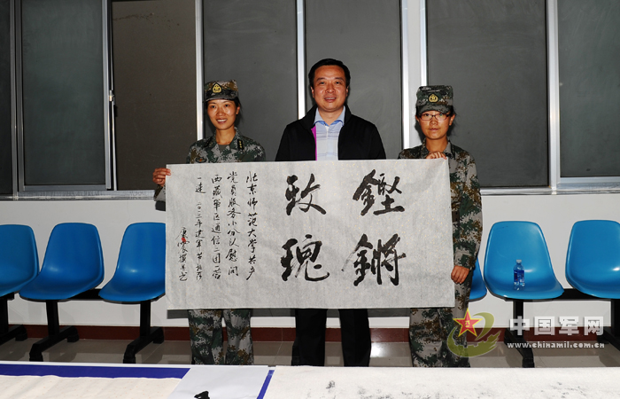 北京师范大学康震教授为西藏军区某团女兵连赠送书法作品。杨乾军摄