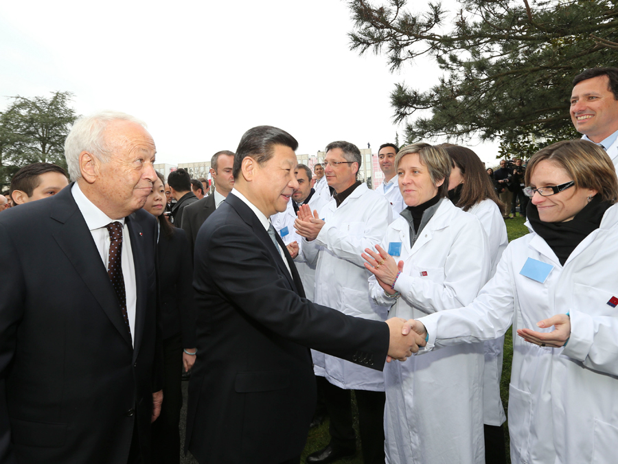 习近平和夫人彭丽媛抵达时,梅里埃集团总裁阿兰·梅里埃及家族成员以及该中心员工列队热烈欢迎。法国政府外长法比尤斯、高教部长菲奥拉索陪同参观。