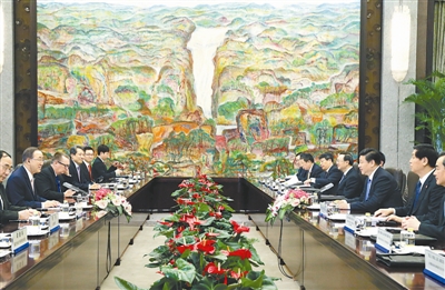 习近平指出,国际社会应该共同努力,促进世界和平与发展。一是坚持政治解决冲突的方向。世界上热点问题不少,按下葫芦起了瓢。解决这些问题要既得理又得法,一味示强施压不行,外部武力干预更要不得,政治解决是唯一出路。联合国要高举这面旗帜。二是坚持实现共同发展的目标。联合国要发挥政治、道义优势、统筹协调作用,制定2015年后发展议程,以消除贫困为核心,实现可持续发展。中方希望今年9月举行的联合国气候变化峰会取得成功。三是坚持联合国在国际事务中的引导作用。在反恐问题上,联合国应该有更大作为,倡导鲜明的是非标准,推动国际社会坚决打击任何形式的恐怖主义。在网络问题上,联合国要发挥主渠道作用,讲规则、讲主权、讲透明,尊重各国在信息安全上的关切,实现共同治理。中国将继续坚定支持联合国工作。