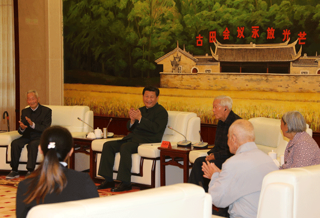 全军政治工作会议10月30日在福建省上杭县古田镇召开,中共中央总书记、国家主席、中央军委主席习近平出席会议并发表重要讲话。这是10月31日,习近平接见老红军、军烈属和“五老”同志代表。本报记者 周朝荣摄