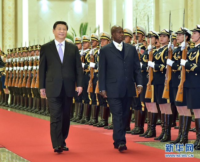 3月31日,国家主席习近平在北京人民大会堂同乌干达总统穆塞韦尼举行会谈。会谈前,习近平在人民大会堂北大厅为穆塞韦尼举行欢迎仪式。新华社记者黄敬文摄