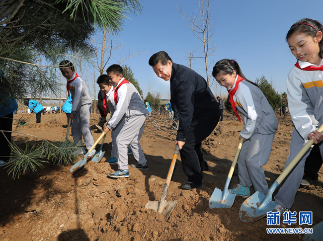 习近平强调,绿化祖国,改善生态,人人有责。要积极调整产业结构,从见缝插绿、建设每一块绿地做起,从爱惜每滴水、节约每粒粮食做起,身体力行推动资源节约型、环境友好型社会建设,推动人与自然和谐发展。