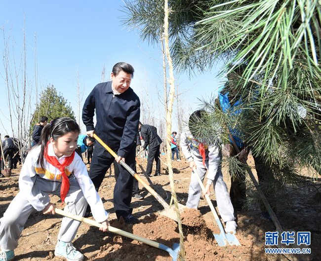 4月3日,党和国家领导人习近平、李克强、张德江、俞正声、刘云山、王岐山、张高丽等来到北京市朝阳区孙河乡参加首都义务植树活动。这是习近平同大家一起植树。 新华社记者 张铎 摄