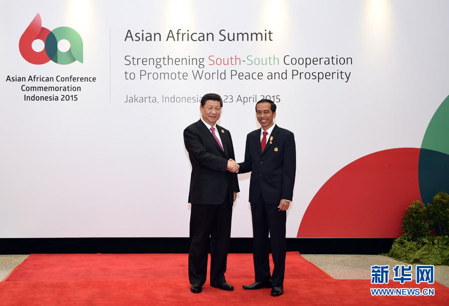 4月22日,国家主席习近平在印度尼西亚首都雅加达出席亚非领导人会议开幕式并发表讲话。这是习近平同印度尼西亚总统佐科握手。新华社记者 谢环驰 摄