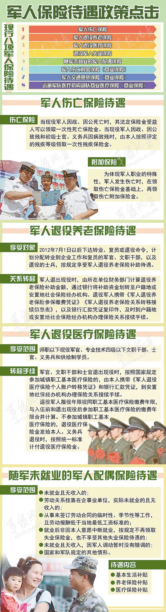据介绍,军人保险是通过国家立法设立专项基金,在军人遇到职业风险、职业连带风险和社会风险损失时,给予军人或其家属的经济补偿,是国家社会保障体系的重要组成部分。目前,现役军人依法享受的军人保险待遇有8项,即:军人伤亡保险、军人伤亡附加保险、军人退役养老保险、军人退役医疗保险、退役军人失业保险、军人交通意外保险、远离军队医疗机构部队商业医疗保险、随军未就业的军人配偶保险。