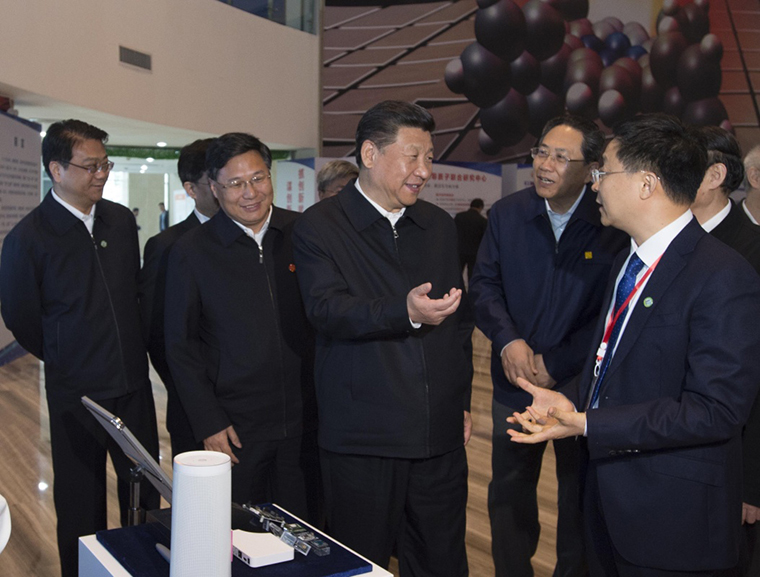 这是4月26日上午,习近平在中国科技大学先进技术研究院观看高新技术企业科技成果展示。新华社记者 李学仁 摄