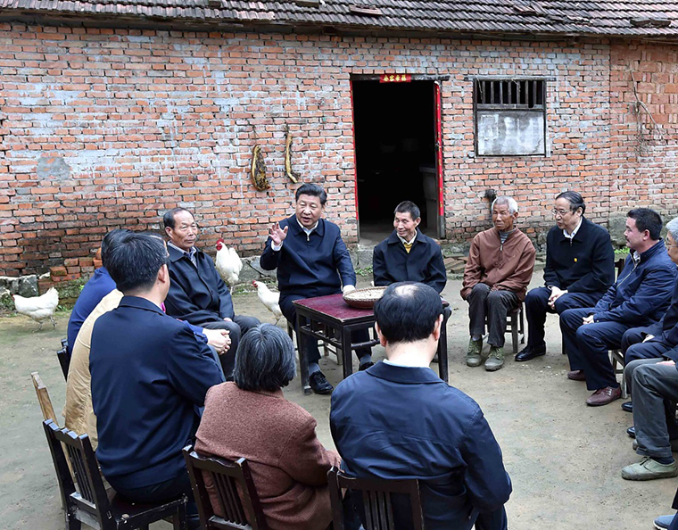 这是4月24日下午,习近平在六安市金寨县花石乡大湾村村民陈泽申家同村民们亲切交流。新华社记者 李涛 摄