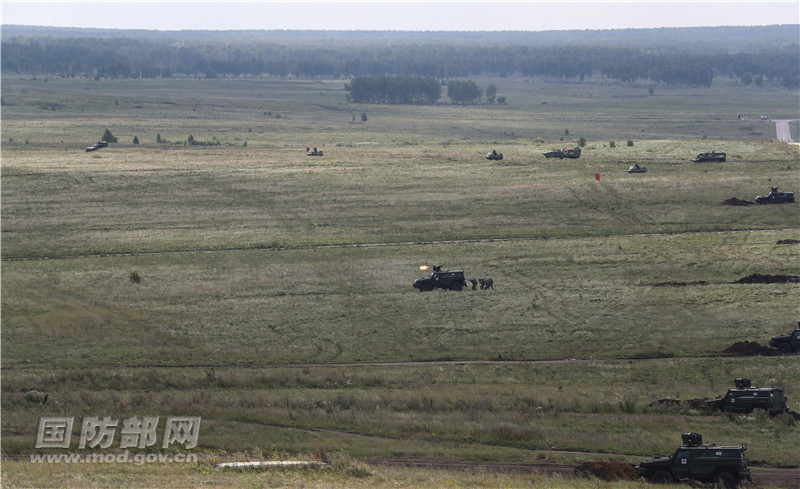 出席上海合作组织成员国第五次军队总参谋长(联合参谋部参谋长)会议的各国代表团团长在车里雅宾斯克集体观摩“和平使命-2018”上海合作组织联合反恐军事演习并出席结束仪式。图为演习现场。李晓伟摄