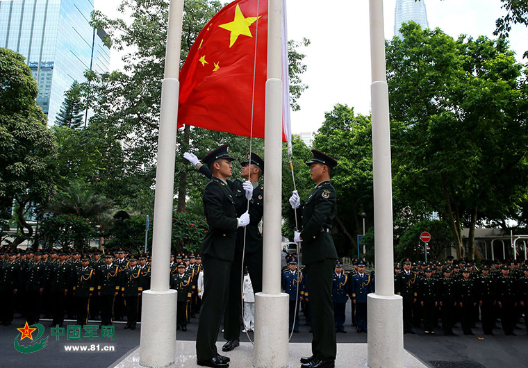 中国军网香港7月1日电 周汉青、易定、崔健报道:1日7时整,在嘹亮的国歌声中,驻香港部队中环军营全体官兵整齐列队,面向国旗庄严敬礼。与此同时,驻香港部队陆海空三军分别在昂船洲、石岗、新围、枪会山等营区也同步举行升国旗仪式,庆祝香港回归祖国19周年。