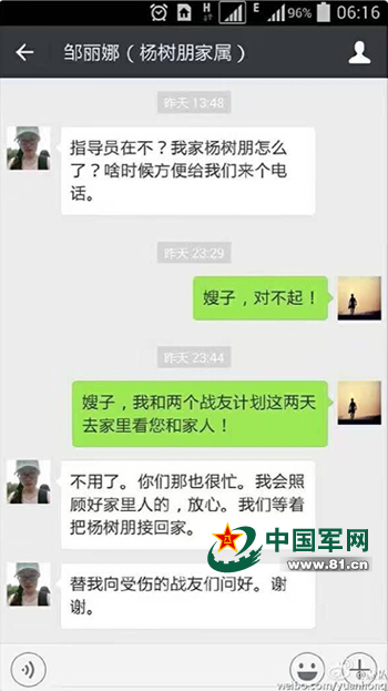 “嫂子邹丽娜是昨天下午13:48给我发的微信,杨班长是13:57离开的。”文海地告诉记者,他一直怀着忐忑不安的心情,不知道该如何回复嫂子的微信,直到晚上23:29才忍痛发出了五个字:“嫂子,对不起!”当听说部队准备去家里看望时,邹丽娜很快回复“不用了。你们那也很忙。”,还不忘叮嘱“替我向受伤的战友们问好。谢谢。”