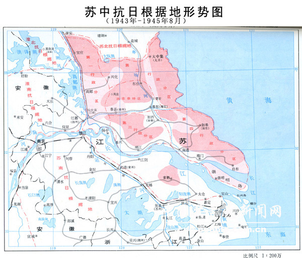 苏中抗日根据地:位于江苏省中部,包括扬州、泰州、南通等地区,东临黄海,南至长江,与苏北、淮北、淮南、皖江等华中抗日根据地相连。皖南事变前统称苏北。1941年3月,苏中区党政领导机构成立,苏中抗日根据地开始形成。