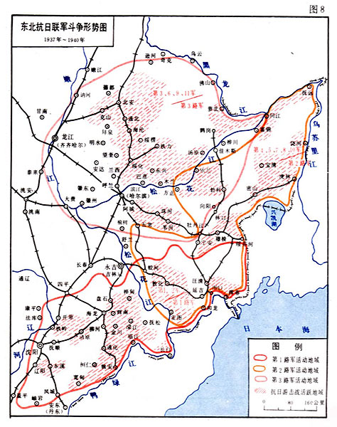 东北抗日联军:1936年2月,在中国共产党领导下,东北各抗日部队统一改编为东北抗日联军,由杨靖宇领导。“卢沟桥事变”后,抗日联军团结广大群众,进一步开展了广泛持久的抗日武装斗争。他们以打击敌人后方和援助关内抗日为中心任务,破坏交通,使日本侵略军疲于奔命。后来,日军主力回师敌后,东北抗战转入极端困难时期。东北抗日联军被迫出没在大森林中。在冰天雪地,弹尽粮绝的情况下,和装备优势的日军坚持斗争,直到获得最后胜利。