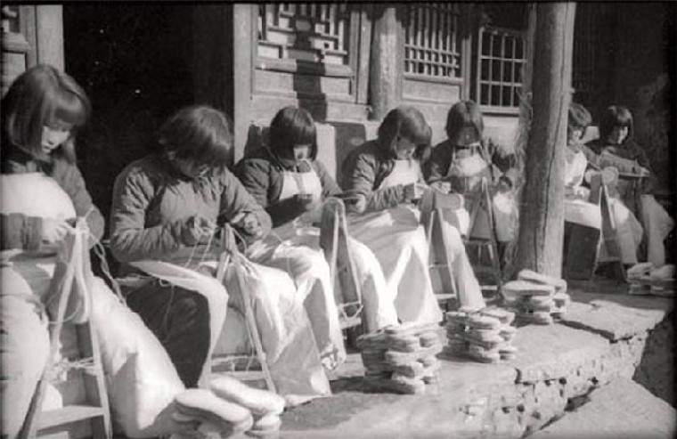 1939年,晋察冀边区供给部女八路为前线战士赶做军鞋。