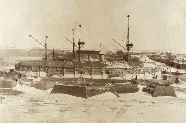 1894-1895年,营口,为保护欧美人员的美英军舰被冰封在船坞里。
