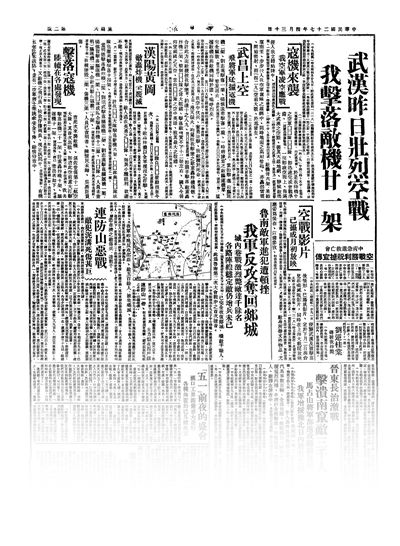 严浩介绍说,武汉空战主要有三次大捷,其详细情况在当时《新华日报》报道中均有具体的呈现。“第一次大捷发生在1938年2月18日,随后的相关报道持续了好几天,很是鼓舞人心。”严浩说,当时正值南京失守,国破家亡的危机笼罩着神州大地,到处人心惶惶。“二一八”武汉空战的胜利,无疑是为当时惴惴不安的百姓们注入了一针强心剂。《新华日报》20日发表的短评《庆祝空军胜利》更是将这一消息传向各地:“前日敌机侵袭武汉,我空军健儿奋勇杀敌,击落敌机 11 架,为我空军在汉第一次空前大捷,此种壮烈战绩实为我空军无上光荣。”