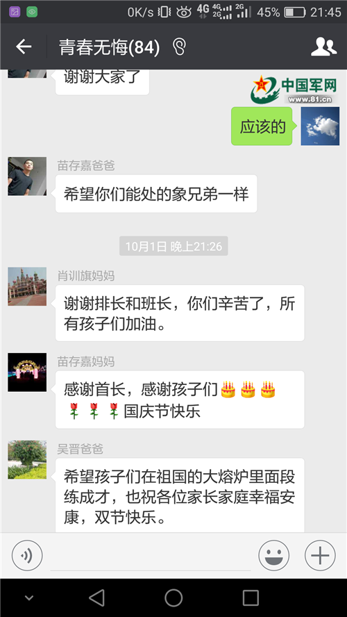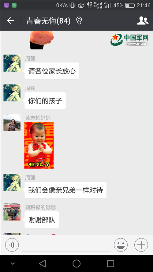 二是微信平台加强实时互动。干部骨干通过微信聊天的方式及时准确向家长反映新兵思想状况、现实表现和心理特点等情况,与家长探讨新兵对部队生活、训练及管理等方面的看法,深入挖掘其内心思想根源。在做好保密工作的前提下,通过家长微信群,定期提供新兵的生活照、笑脸照、娱乐照,并将新训工作中的好人好事反馈给家长,家长也能在微信群中发送“家长寄语”,共同激励新兵不断成长进步。