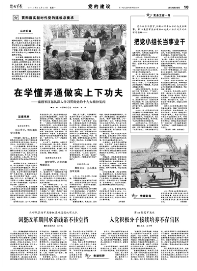 党小组长绝不只是“收收党费、下下通知”,而是应该勇于尽责,把党小组活动的原则性战斗性突显出来。请关注今日出版的《解放军报》的报道——