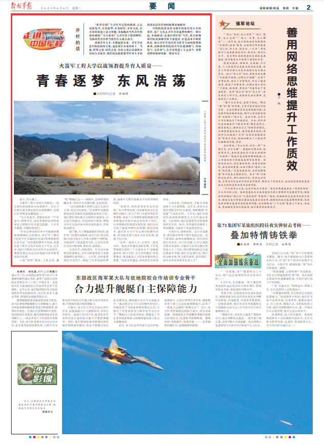 军队院校担负着为强军伟业培育人才的重任,是广大有志青年青春逐梦的舞台。即日起,《解放军报》2版推出“走进中国军校”专栏,重点展现我军院校加强学科专业建设、打造高水平师资队伍、加大青年学员培养力度等方面的优势和成果,反映新时代院校青年以蓬勃朝气、昂扬锐气、无畏勇气,在青春赛道上矢志奋斗、勇攀高峰的精神风貌。敬请关注。