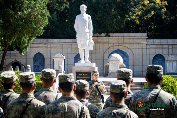 学员们在国际主义战士柯棣华的雕像前聆听教员的深情讲述。