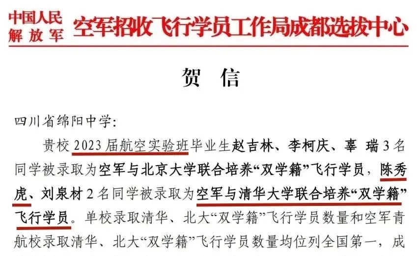 高中时陈秀虎就读于绵阳中学航空实验班