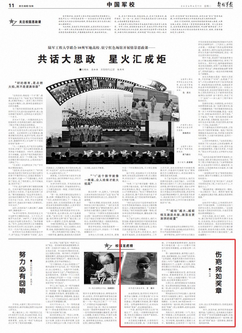 如今,谈及伤疤,姜烈坦然卷起裤腿笑道:“这俩印记,是我重新出发最好的‘奖章’!”未来军旅路难免磕绊,但他深知:只要还能跟战友们一起训练,膝盖上的“奖章”就会一直陪着他、激励着他向前冲锋。