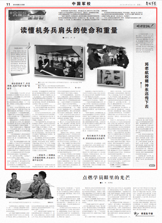 如今,学校立足机务院校实际,将实战化要求融入课堂教学、实训演练,让每一名学员明白:机务工作没有“差不多”,只有“零差错”;没有“旁观者”,只有“守护者”。尹富教员的课堂,教技术也传精神,让机务兵的精神通过一代代学员传承下去。而他牵头的教研团队,贴合一线需求聚力攻坚,彰显了机务院校教员队伍的责任与担当。