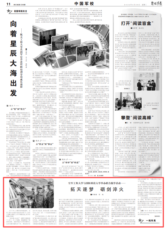 一周时间,空军工程大学的学员们对空天动力领域有了更深入的认识。从长沙返回后,他们和国防科技大学的同学依然保持着联系。谁遇上不懂的问题,两校学员组队线上攻关;之前研学没聊透的知识点,也会互相求教、互通有无。这份没断过的默契,一路带到了空军工程大学的“砺剑”践学现场。