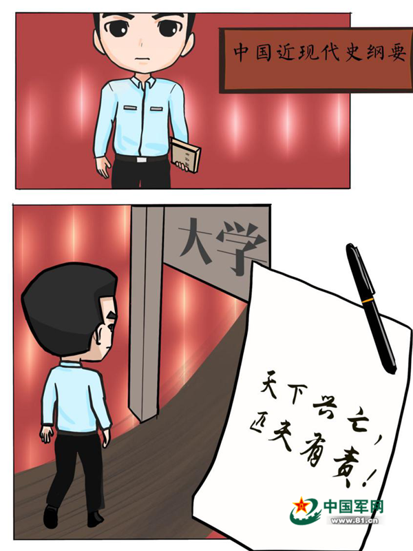 男子手中拿着一本泛黄的《新青年》。他眺望着远方的大海,期盼着远方尚在归途的铁甲舰,心潮就像海浪一样起起伏伏,很久难以平静,转身走进了他梦寐以求的大学,拿出了自己的钢笔,在纸上写下了:“天下兴亡,匹夫有责!”