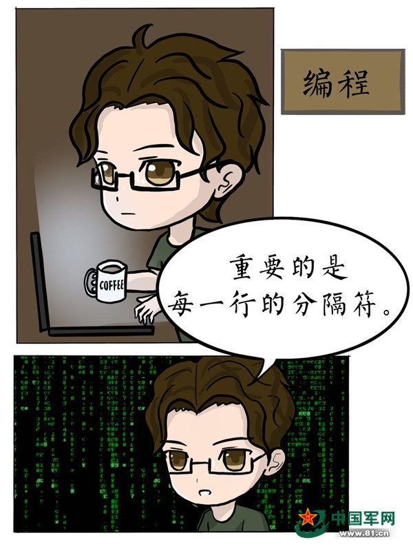 键盘上不断地发出噼里啪啦的声音,漆黑的夜中,只有那一小块屏幕闪烁着昏暗的光。男子扶了扶厚重的眼镜,喝了几口冰凉的咖啡,一行行代码在向屏幕的尽头延续。你多么期待着他按下那个运行键,他转过头来,却说:“重要的是每一行的分隔符。”