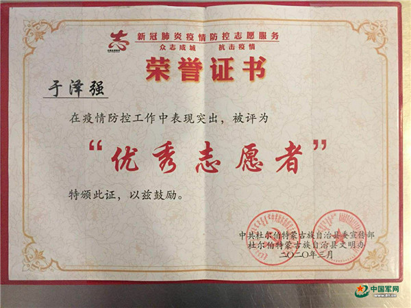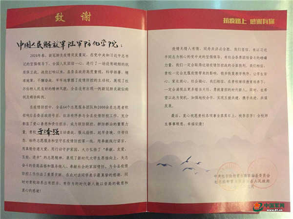 “在疫情防控中,贵校于泽强主动请战,为全县疫情防控工作做出了重要贡献,在此对贵校培养出有担当、有作为的时代新人致以崇高的敬意……”近日,一封来自杜尔伯特蒙古族自治县县委、县政府的致谢信,引起了陆军防化学院学员们的热议。