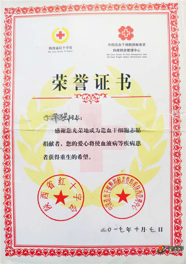造血干细胞志愿捐献者证书。
