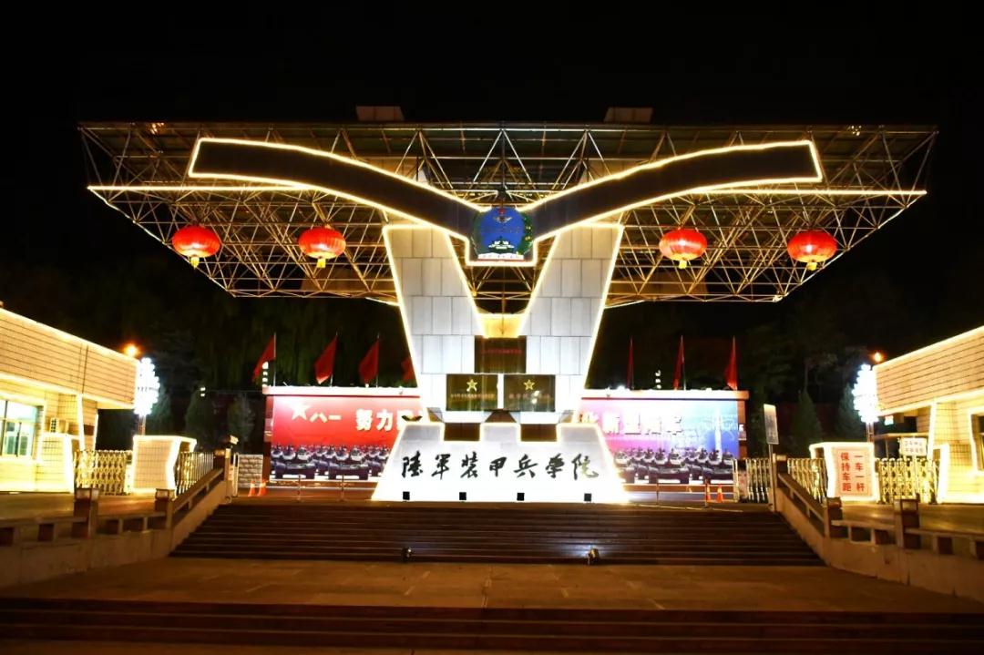 一辆坦克车彩印在石壁上,两批骏马奔腾而来,暖黄色、冰蓝色、橙红色交替变幻的灯带,勾勒出学院特有的“布达拉宫”。