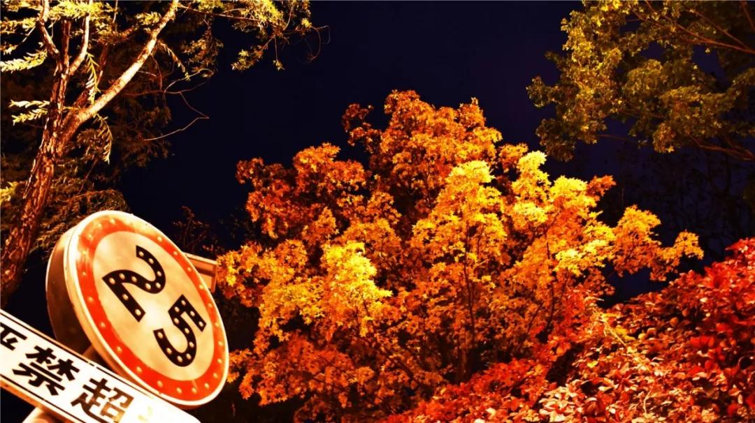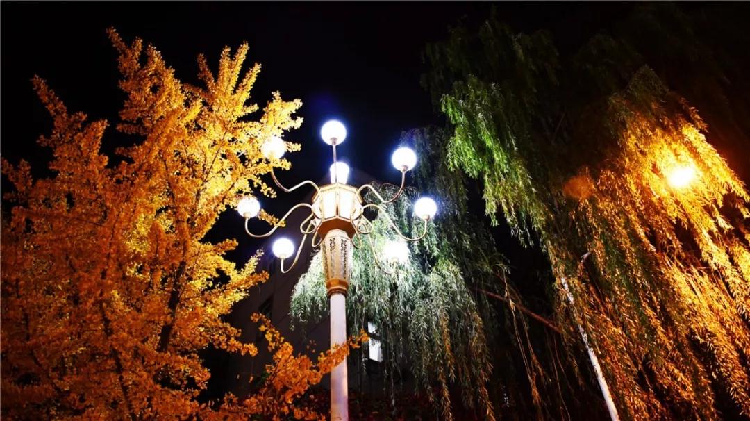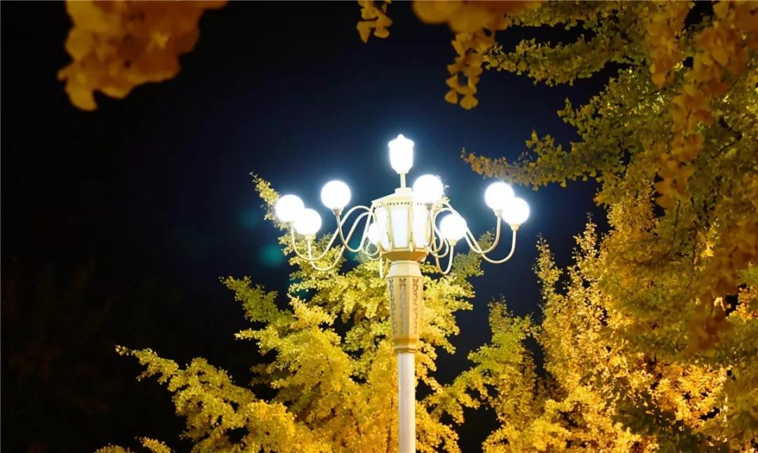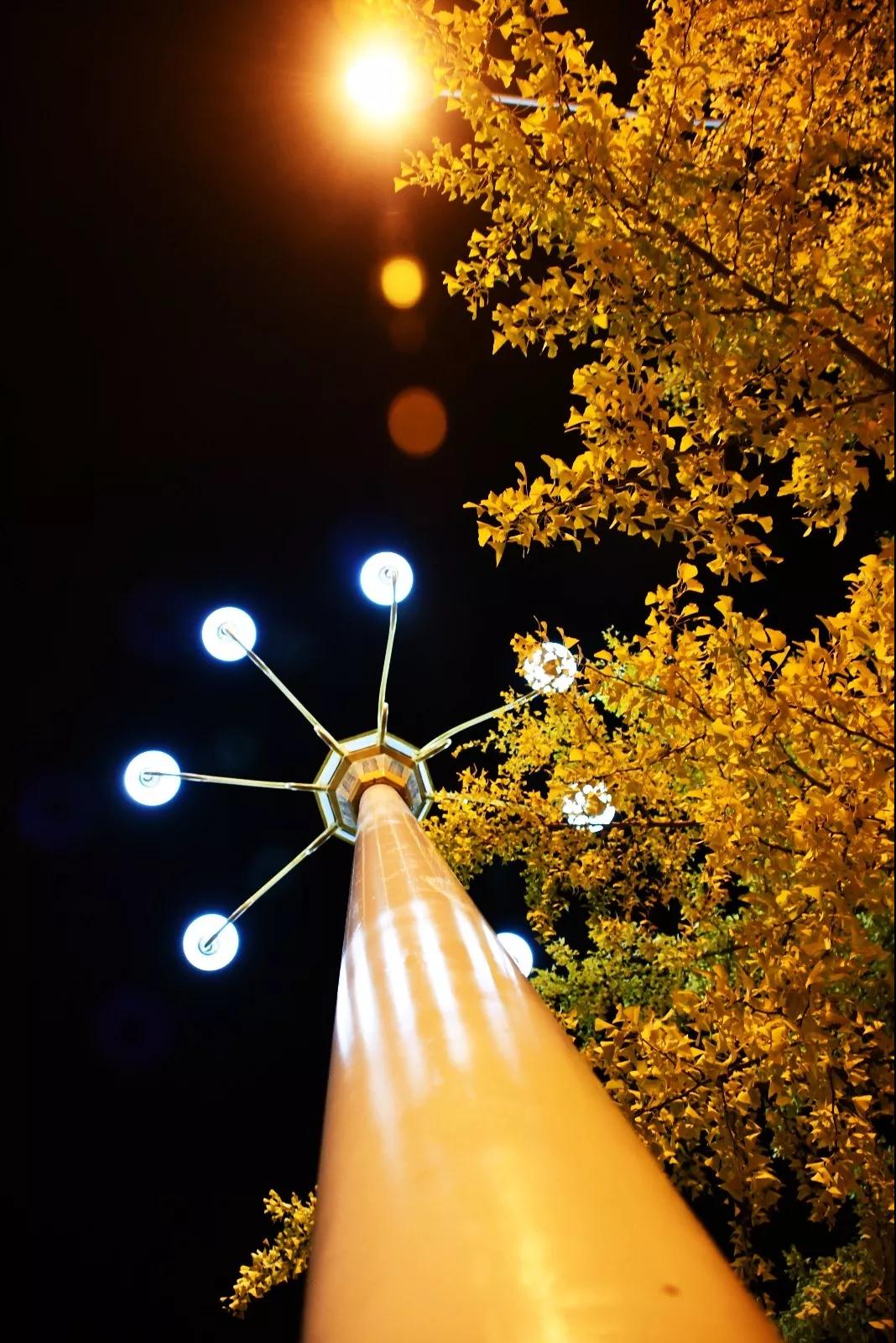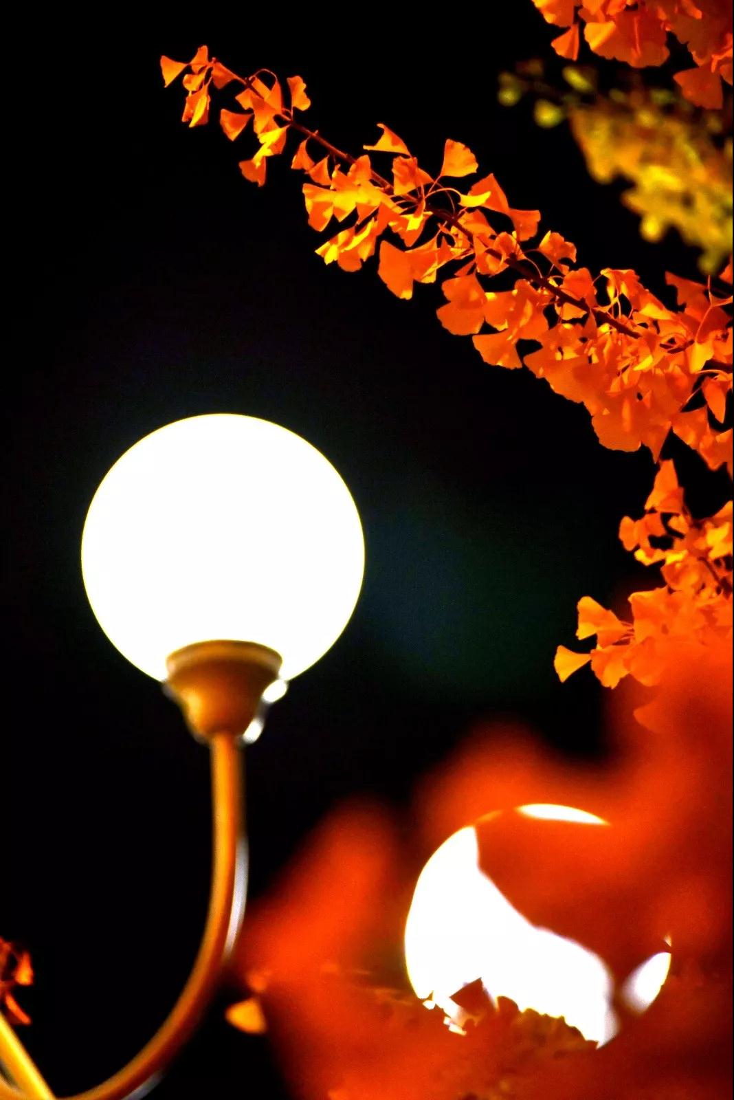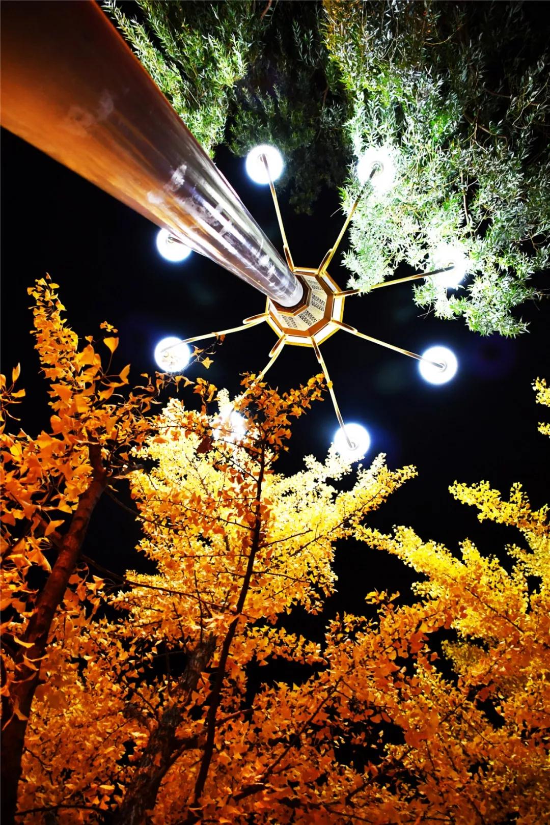 斑驳的灯光下,秋日的银杏叶格外金黄璀璨。色彩斑斓的“火树银花”,将铁甲路装点得炫目动人。